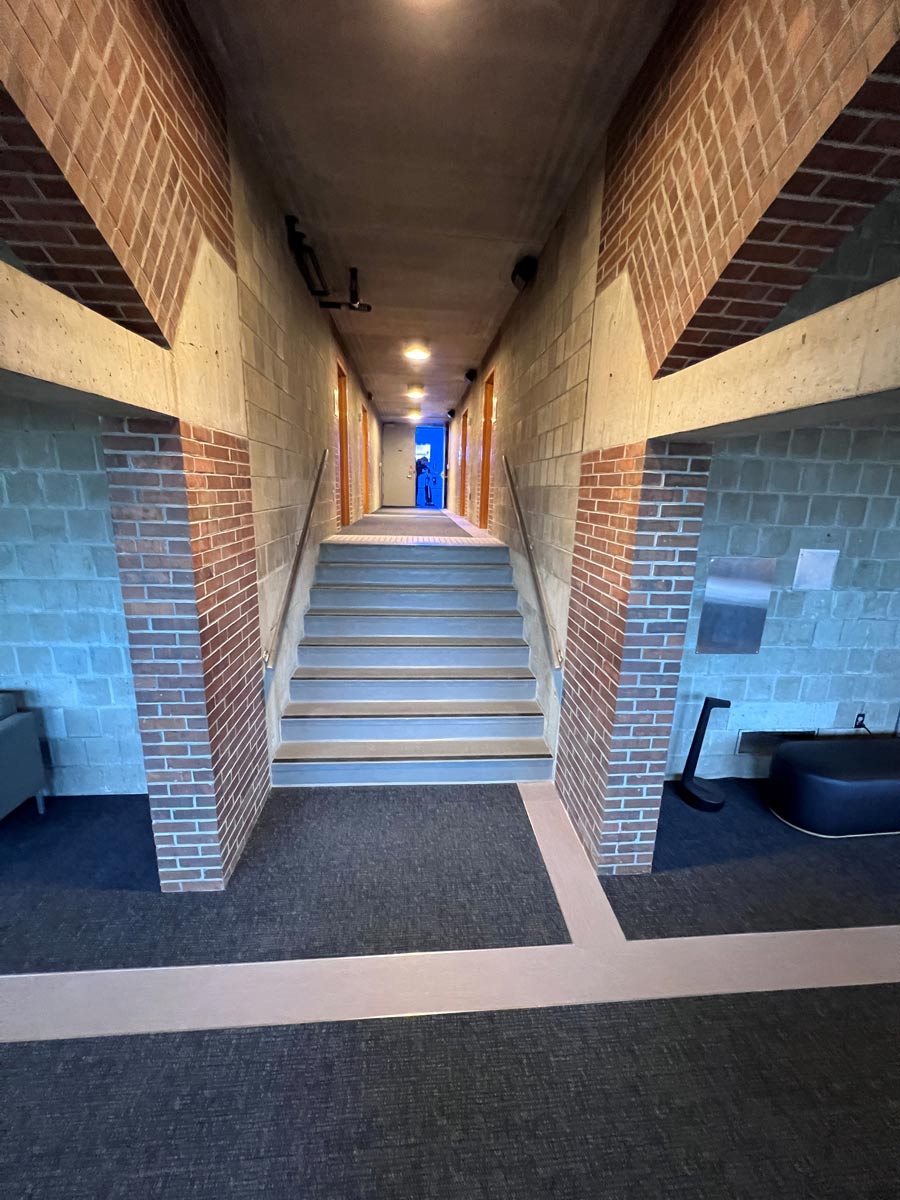 Cane trail and tactile floor indicators marking stairs and pathways around back of house corridors. (Photo by author)