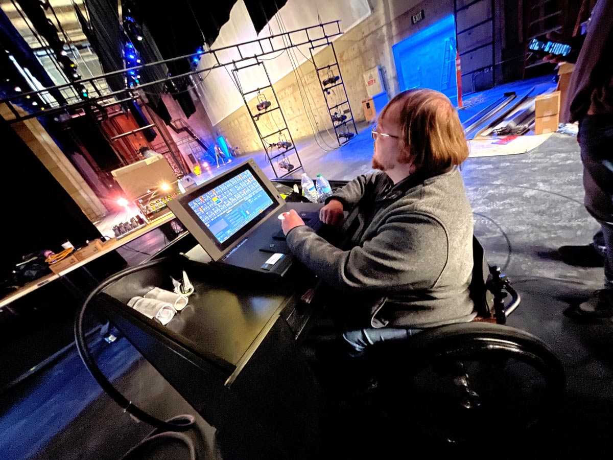 Adjustable height mobile motorized rigging control console. The console is designed to accommodate users with low grip (less than 5lbs of grip/push force required), low visibility (GUI adjustments and high contrast graphics), and mobility challenges. (Photo by author)